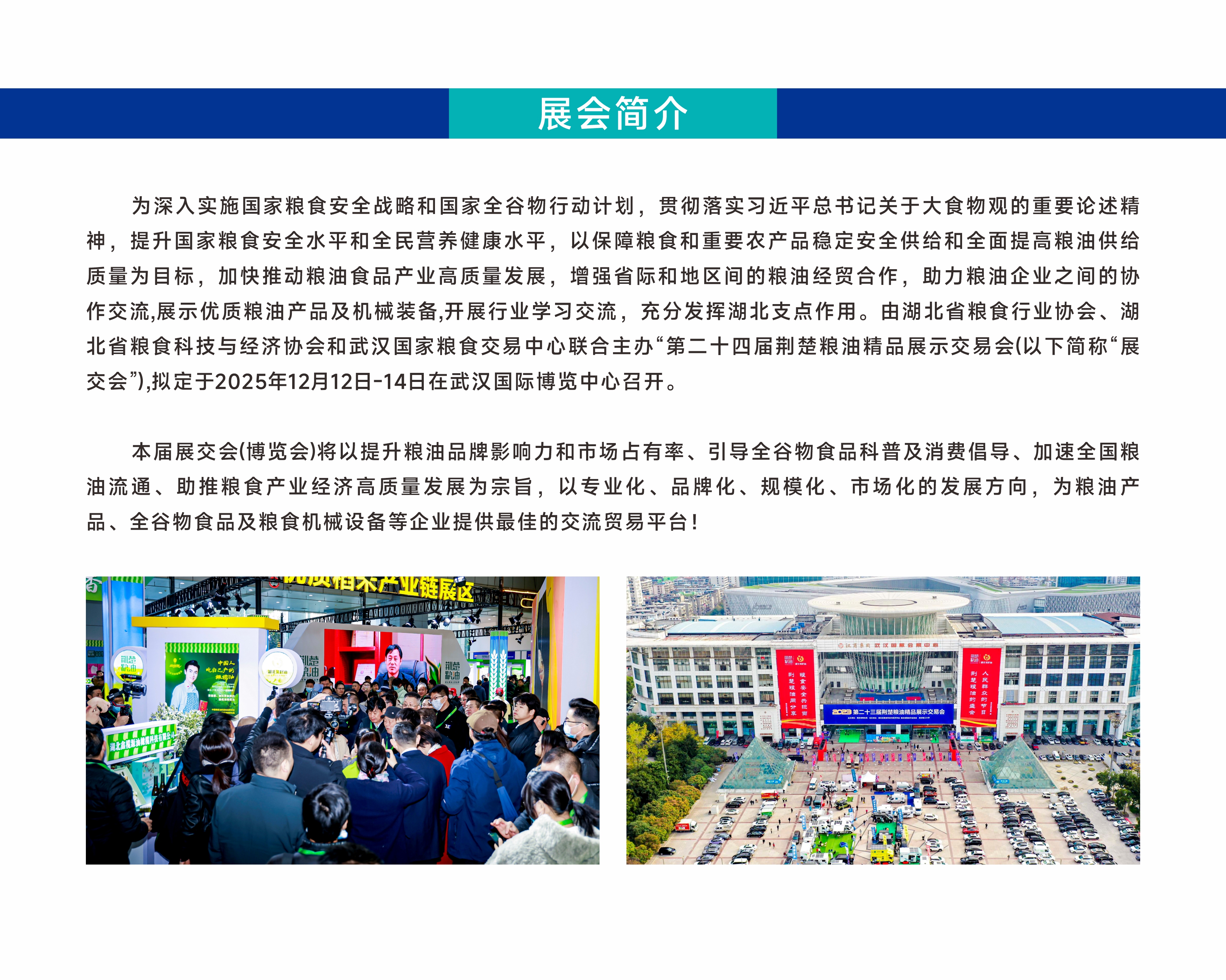 由湖北省粮食行业协会、湖北省粮食科技与经济学会和武汉国家粮食交易中心联合主办“第二十四届荆楚粮油精品展示交易会(以下简称“展交会”),将于2025年12月12日-14日在武汉国际博览中心召开